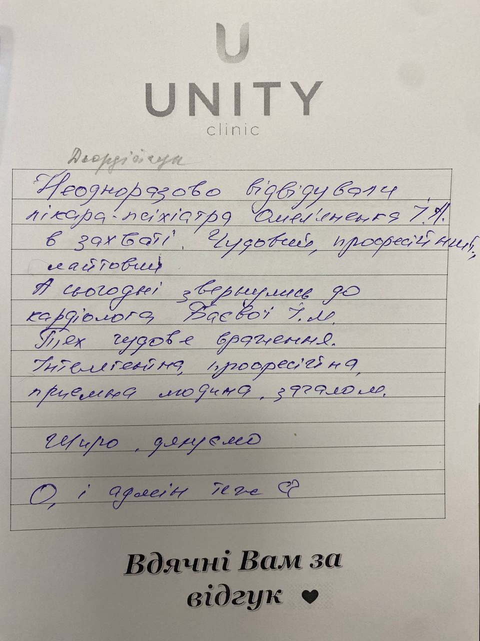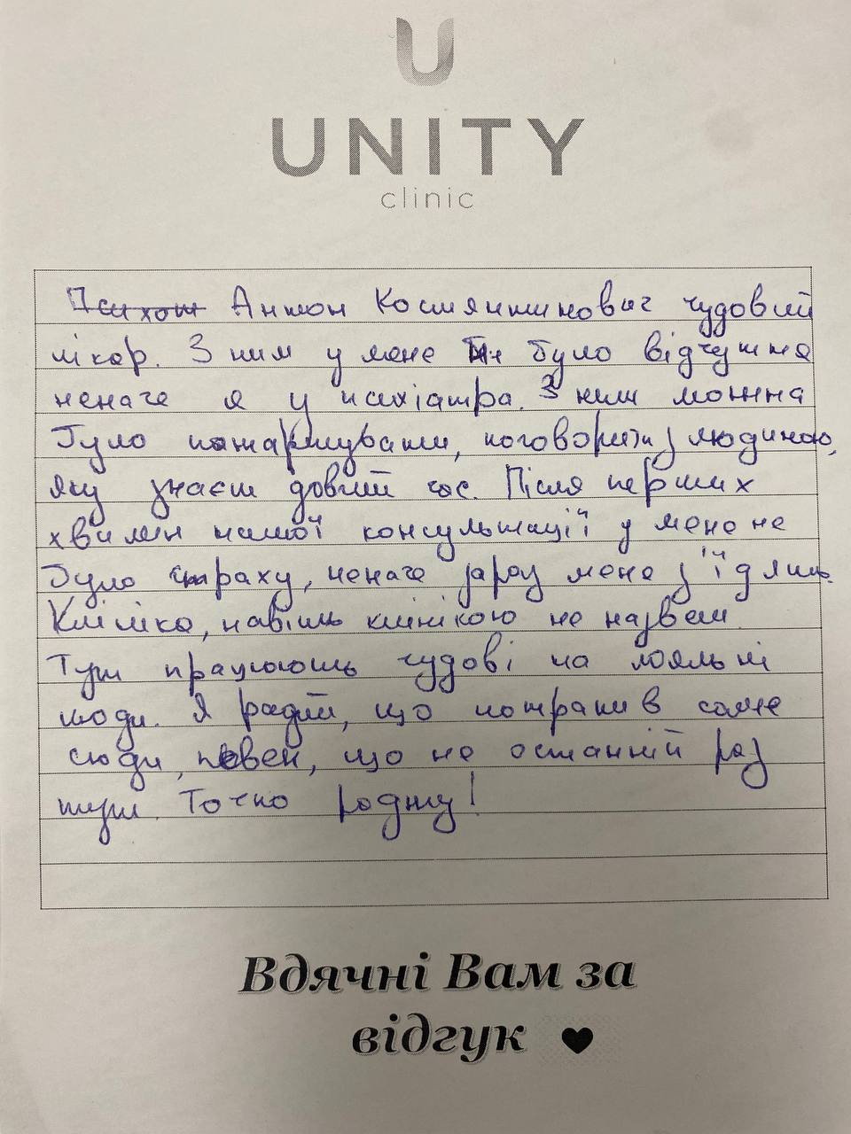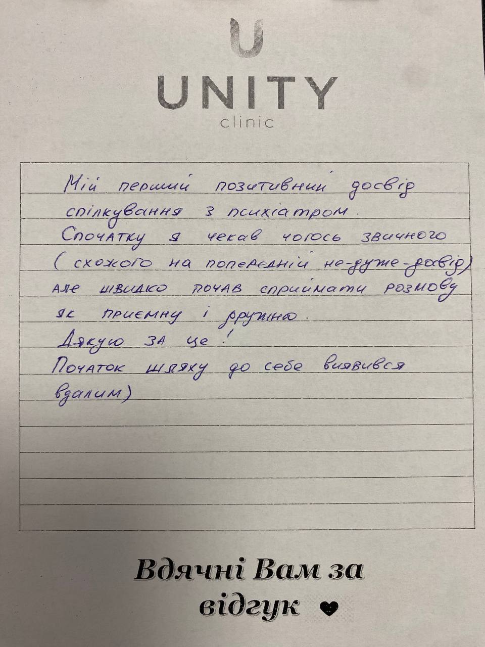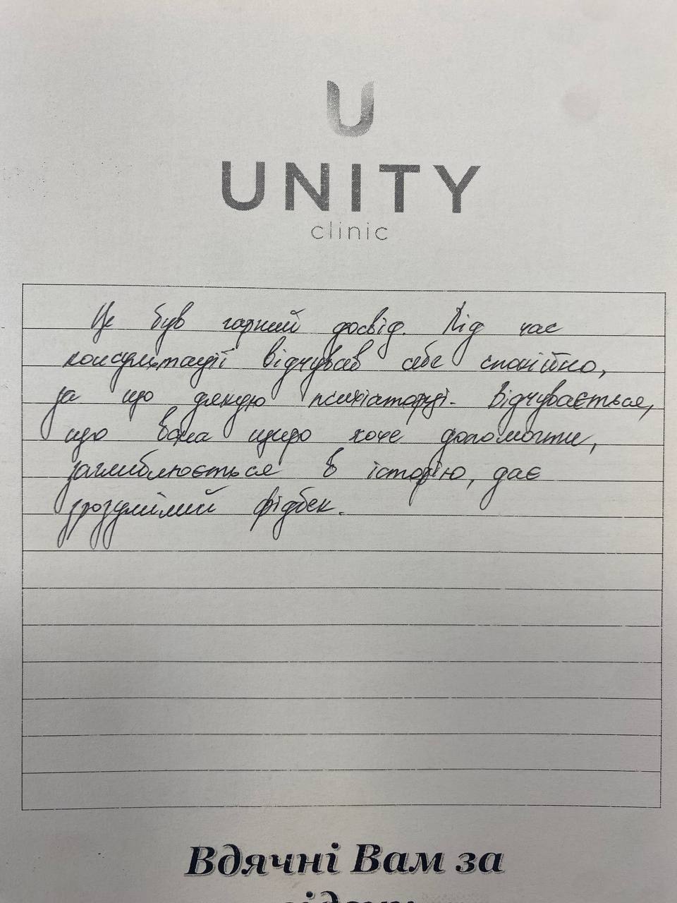Хороший персонал, дуже приємна та спокійна атмосфера, не було проблем із записом чи скасування запису, була в психіатра і була задоволена їх професіоналізмом