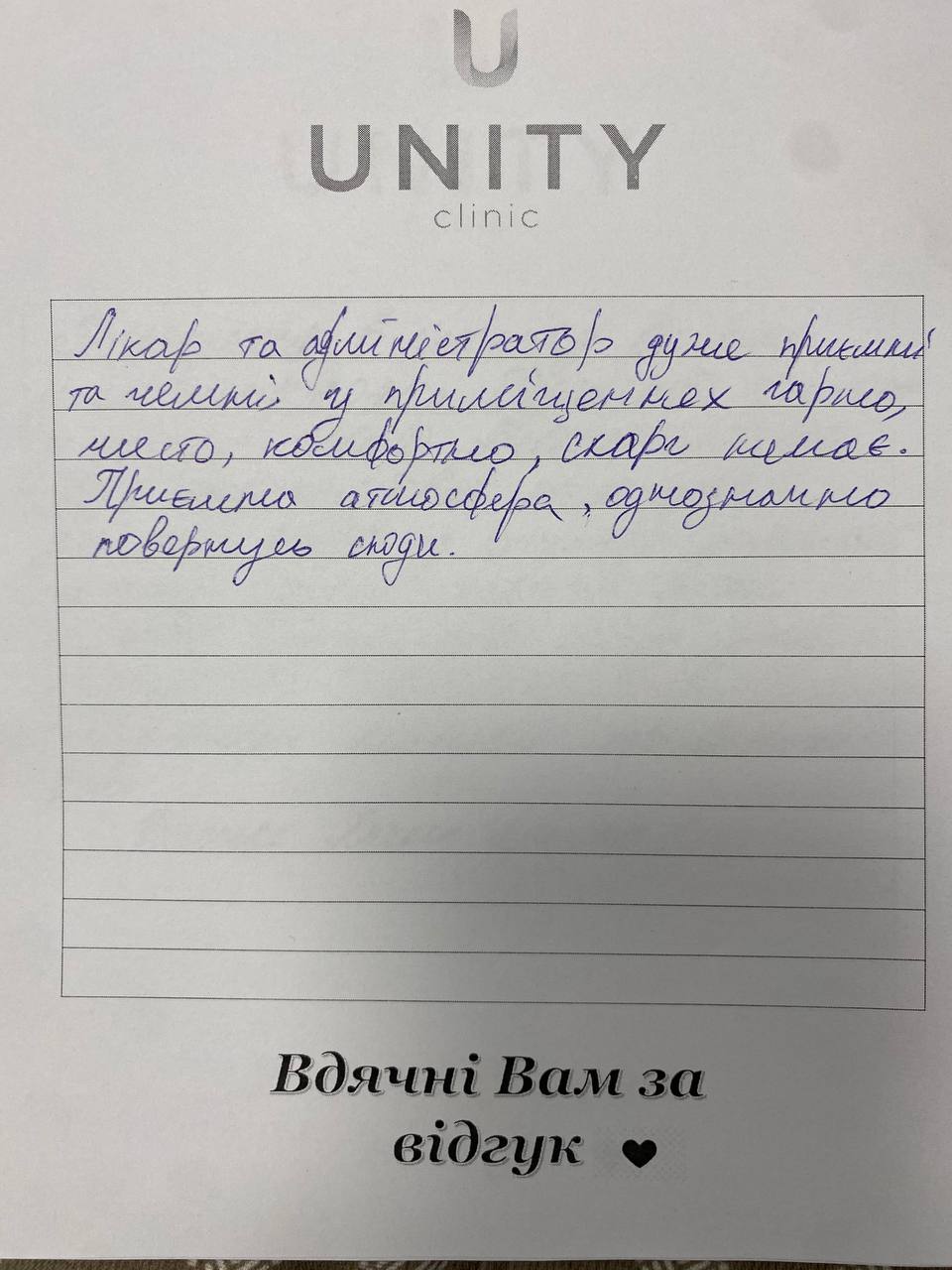 Допомогли з визначенням подальших дій в отриманні потрібного діагнозу. Дружня, приємна атмосфера, привітний персонал. Приємно вражена))